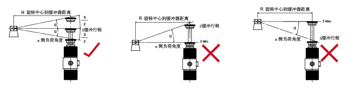 2) 按照下圖所示正確的方式安裝:當緩沖行程壓縮到一半時, 應無側向負荷;